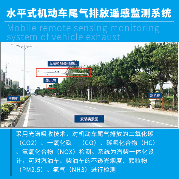 機動車尾氣排放遙感檢測系統是一種固定安裝于龍門架上,可對單向車道上行駛的車輛的排氣污染物進行實時遙感檢測的系統。采用光譜吸收技術,對機動車尾氣排放的二氧化碳(CO2)、一氧化碳(CO)、碳氫化合物(HC)、氮氧化合物(NOX)檢測。系統為汽柴一體化設計,可對汽油車、柴油車的不透光煙度、顆粒物(PM2.5)、氨氣(NH3)進行檢測。