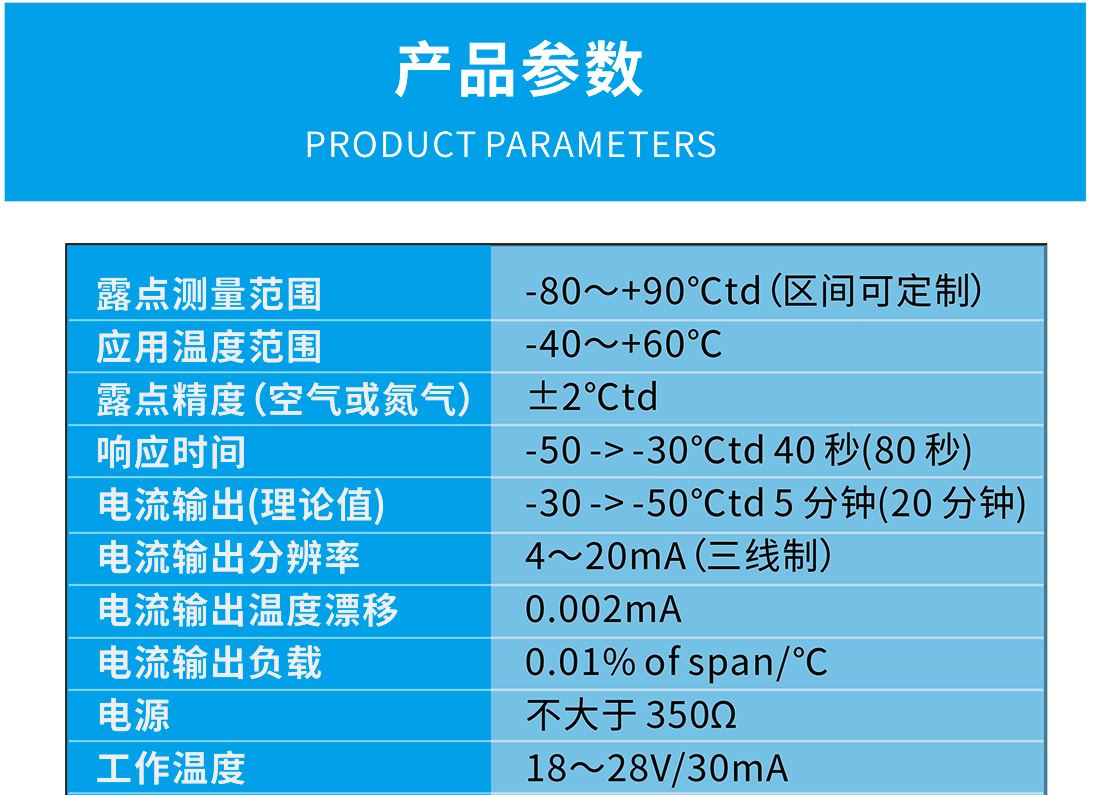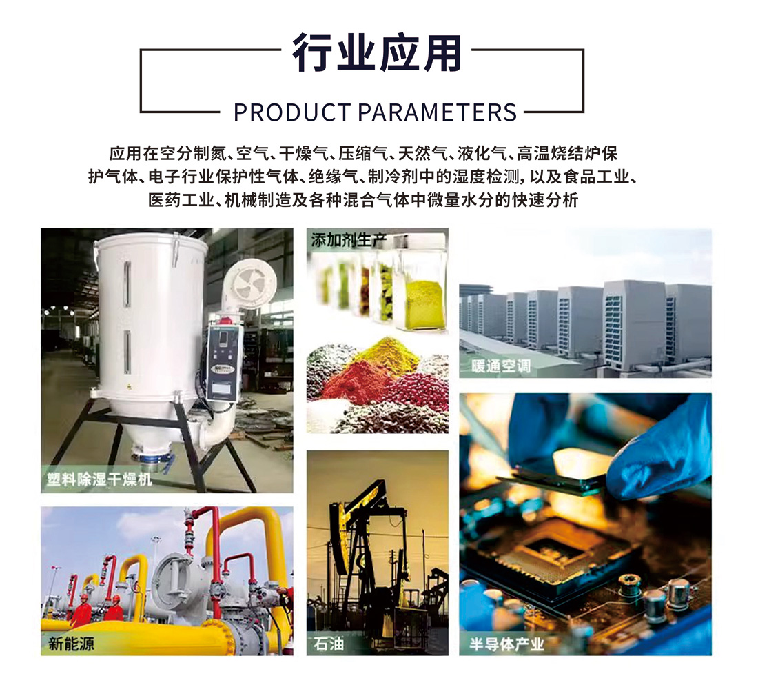 應用 : 應用在空分制氮、空氣、干燥氣、壓縮氣、天然氣、液 化氣、高溫燒結爐保護氣體、電子行業保護性氣體、絕緣氣、制冷劑中的濕度檢測,以及食品工業、 醫藥工業、機械制造及各種混合氣體中微量水分的快速分析