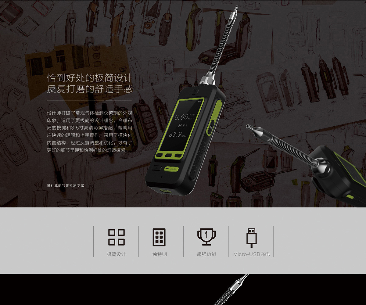 自帶可拆卸吸氣探管≥130mm,雙層管路:內(nèi)設(shè)聚四氟乙烯層,不吸附任何氣體;外加彈簧保護(hù)層,可任意360度折彎不易變形,并取得相關(guān)結(jié)構(gòu)設(shè)計(jì)專利。