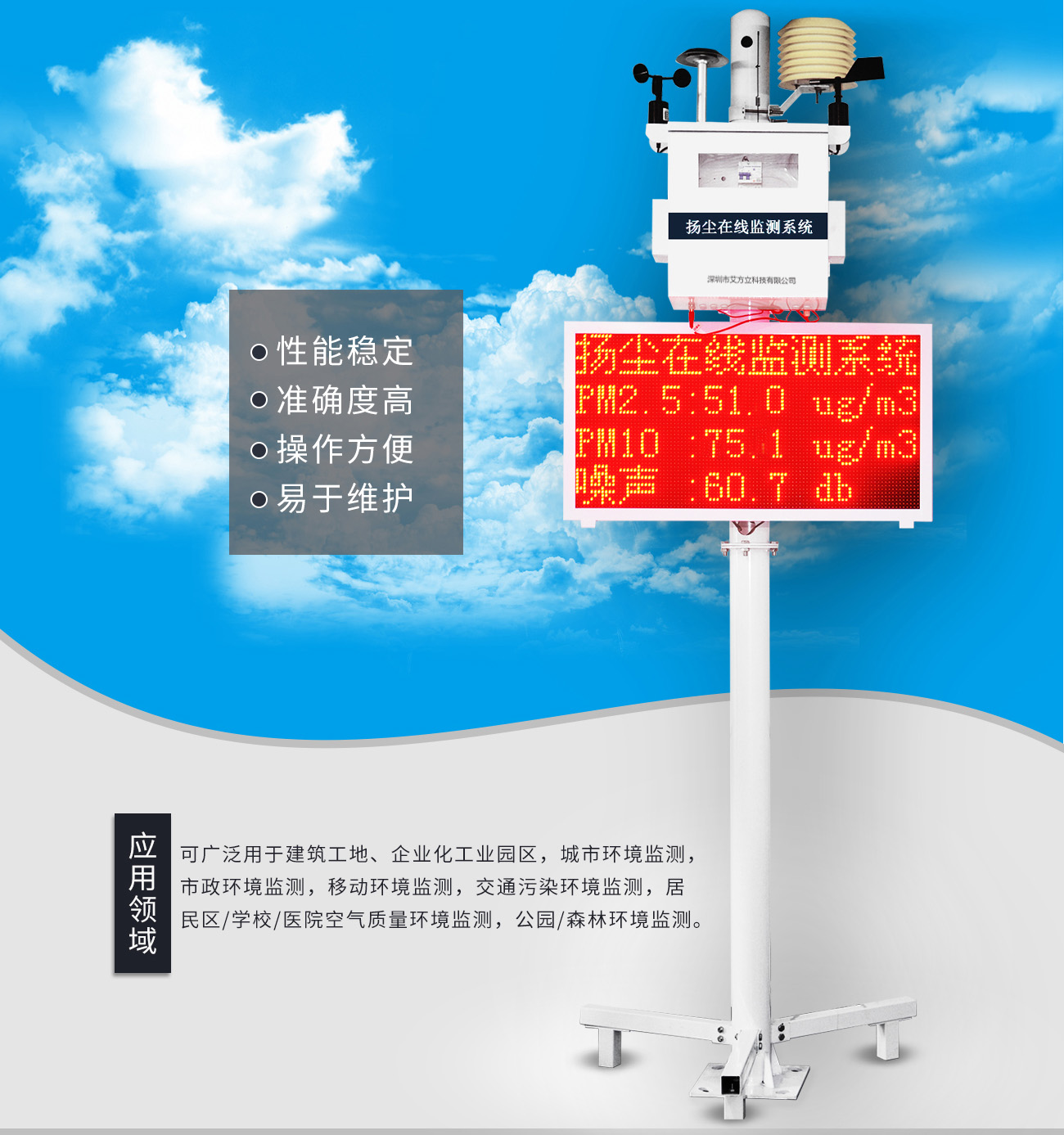 應用 : 企業化工園區,城市環境監測,市政環境監測,移動環境監測,交通污染環境監測居民區/學校/醫院空氣質量環境監測,公園/森林環境監測。
