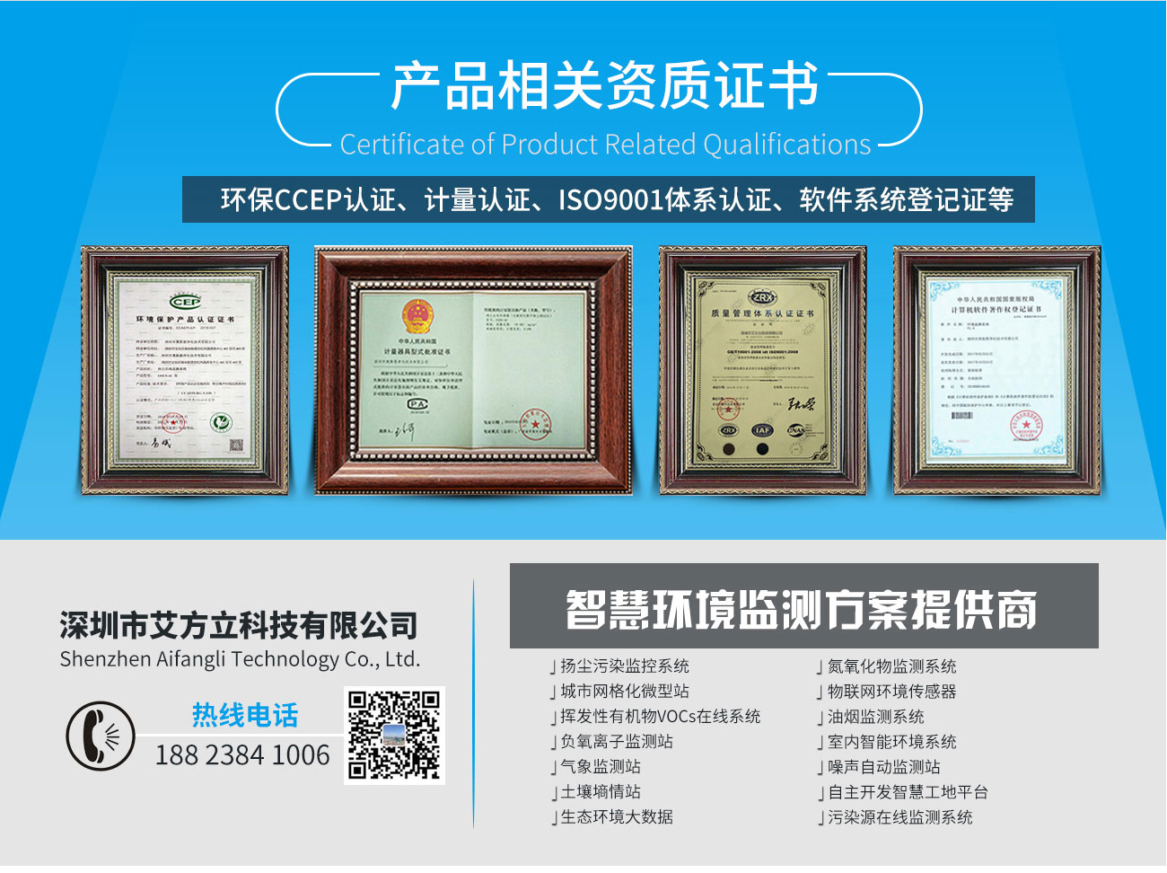 深圳市艾方立科技有限公司是一家專業從事各類室內/外環境及空氣質量檢(監)測儀器終端設備/系統產品的研發、生產、銷售于一體的高科技企業,我們可以為您提供在線式室內空氣質量環境監測/檢測系統設備儀器、負離子監測、土壤墑情監測站、雨量監測站、能見度監測儀、全自動氣象監測站系統設備、大氣網格化空氣質量環境監測站、VOCS揮發性有機物監測儀、建筑工地TSP揚塵噪聲監測儀等一系列系統設備儀器產品。廣泛應用用工廠、酒店、醫院、景區等公共場所,歡迎您來電咨詢訂購。