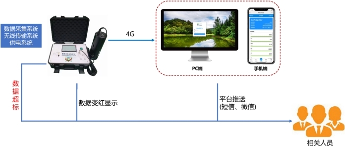 便攜式水質監測儀可同時檢測溶解氧、pH、電導率、濁度、COD、氨氮、ORP等,具有操作方便、體積小巧等特點。采用手提箱設計,可方便攜帶至不同的地方檢測。自帶鋰電池,開機就可以使用,方便使用者戶外水樣測定操作,測定過程簡捷、測定結果準確、節約測定成本。設備搭載觸摸屏顯示實時數值,主控機通過RS485(Modbus/R-TU協議)總線采集和處理各數字傳感器測量得到的數據,并將數據無線傳送到平臺,云端,同時根據用戶需求可以在手機APP等多平臺上獲取傳感器測量值。