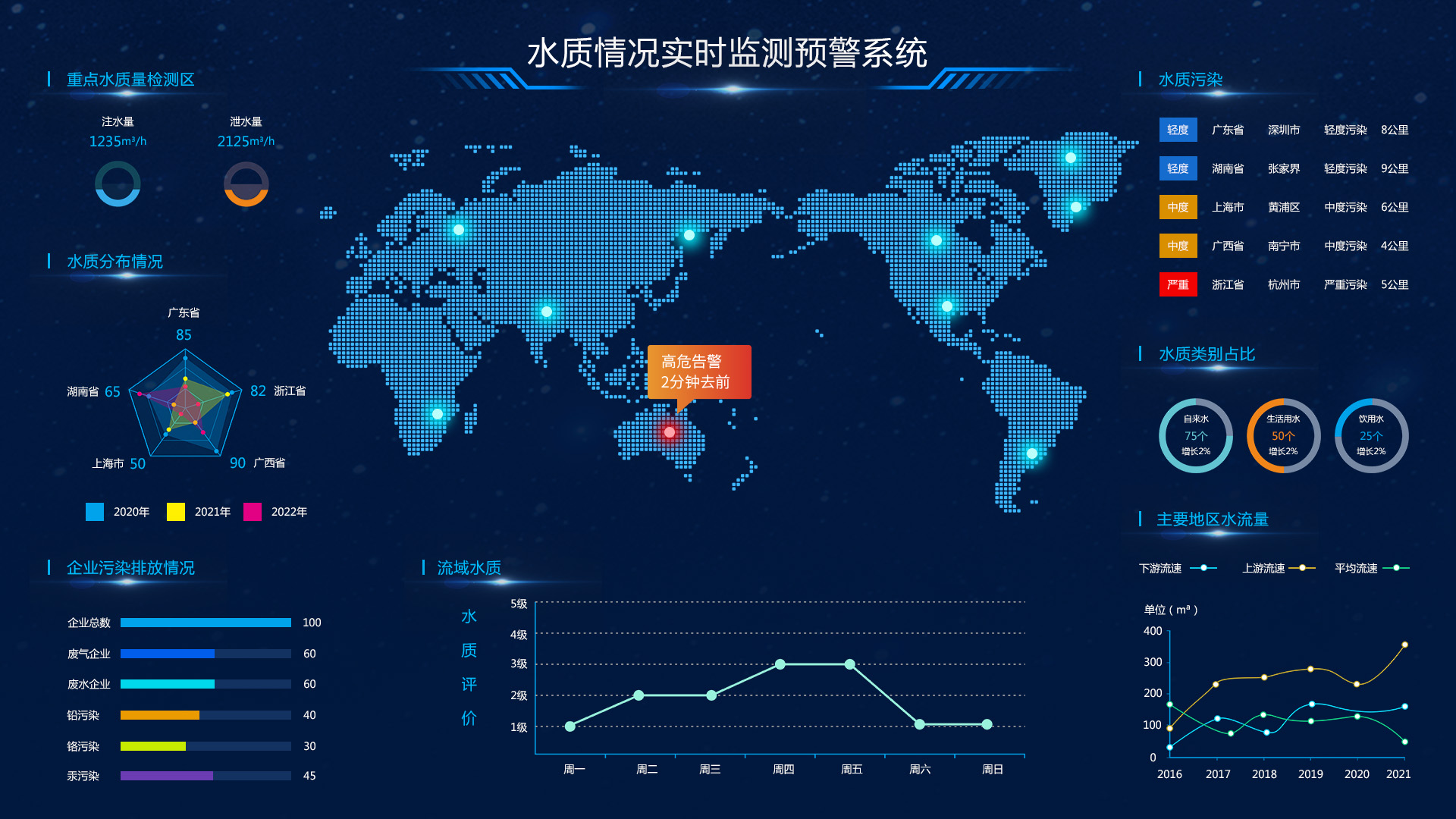 水質監測云平臺(以下簡稱云平臺),通過現場設備對水質數據進行實時監測,并將監測數據在軟件系統進行質控、分析以及應用。數據詳情可進行多元化展示,智能分析比對,生成分析報表;結合大數據分析模型,由點及面,網格化全面覆蓋,實現污染溯源,趨勢預測,同時,具備數據監管大屏,直觀呈現數據變化動態,充分滿足監管單位的監測需求。